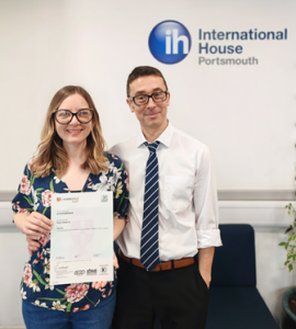 Lyna and Director of Studies Lewis Richards with Lyna’s CELTA certificate Our lovely student Lyna from Ukraine celebrated the arrival of her CELTA