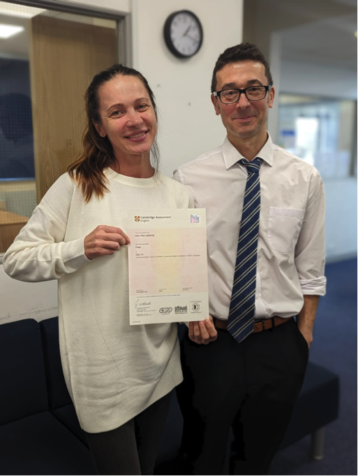 Lyna and Director of Studies Lewis Richards with Lyna’s CELTA certificate